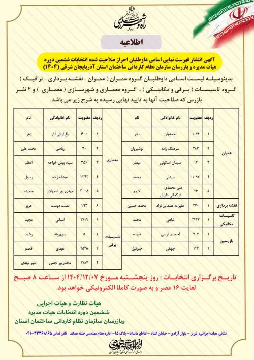 باتوجه به برگزاری الکترونیکی انتخابات ششمین دوره هیات مدیره و بازرس سازمان ؛ بدینوسیله از کلیه اعضای محترم سازمان نظام کاردانی استان تقاضا می شود چنانچه شماره تلفن اعلامی به سازمان را بهر دلیلی تغییر داده اند و یا کدملی خود را اعلام نکرده اند جهت تکمیل اطلاعات هویتی حداکثر تا پایان آذر ماه از طریق شماره تلفن 04134408182 اعلام  و یا به دفتر سازمان حضوری مراجعه اعلام نمایند .